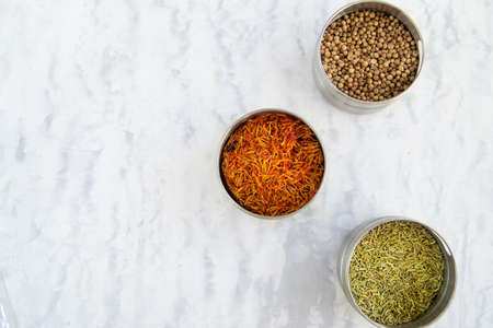 arge set of Indian spices and herbs. On a marble background, copy space