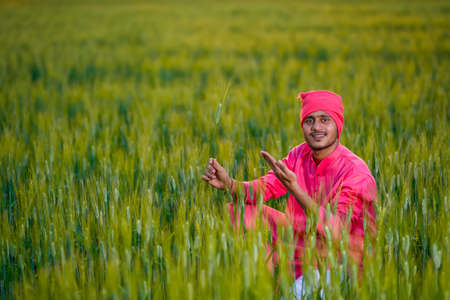 Happy young indian farmer at green wheat field