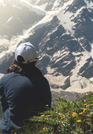 A girl is sitting in a meadow and looking at the mountains. A sporty girl is resting before climbing against the background of snow-capped mountains. A sunny day in the highlands.