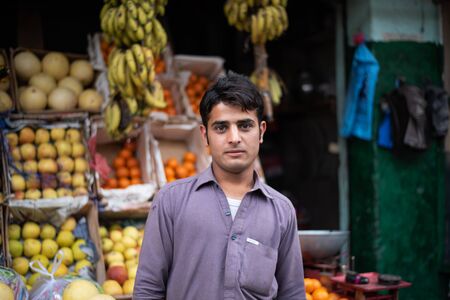 BESHAM, PAKISTAN - April 15, 2018: unidentified man selling fruit on the street market