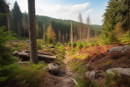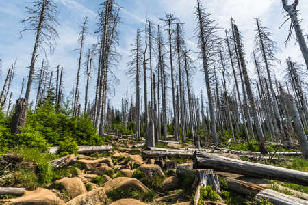 Trees in the German low mountain range Harz which were destroyed by bark beetles. Forest dieback in Germany. Steep path up to the Brocken mountain.