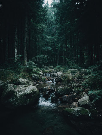 Forest scene with stream flowing through rocks and lush vegetation, shrouded in shadow