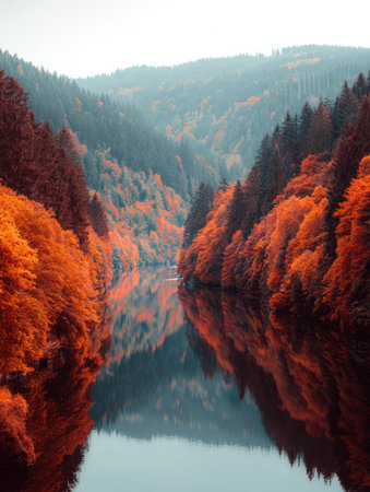 This captivating autumn landscape features a tranquil forest scene with vibrant foliage reflecting in calm water, creating a serene atmosphere.