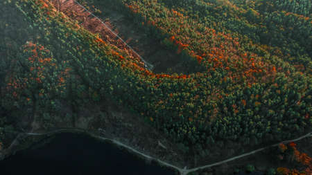 Autumn landscape. Aerial view. Autumn forest on the hill. Clearing with a road to a standstill. Ukraine