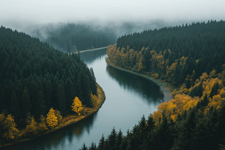 Aerial view showcases a breathtaking landscape featuring a winding river enveloped by vibrant, lush greenery. Generative AI