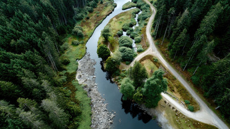 An aerial capture showcasing a serene river winding through a vibrant forest landscape, marked by gravel banks and a meandering road. Experience the tranquility of nature in this breathtaking view.