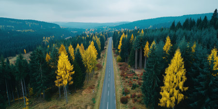 This stunning aerial photograph showcases an empty road winding through a vibrant autumn forest. Trees display bright colors, creating a serene and inviting landscape.