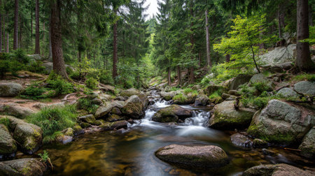A serene river meanders through a lush green forest, surrounded by towering trees and smooth rocks. This peaceful natural landscape invites reflection and tranquility.