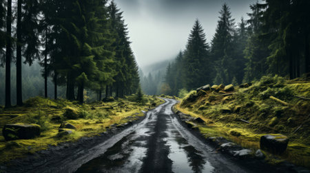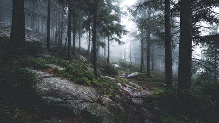 Explore a serene and misty forest path surrounded by tall pine trees and rocky terrain, creating a mysterious atmosphere perfect for nature lovers and outdoor enthusiasts.