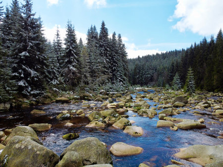 Jizera River, Pedestrian Bridge on the Border of Poland and the Czech Republic. Mountain landscape