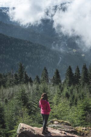 Millenial girl on a rock admiring the Hornisgrinde mountains covered by fir forest and clouds, in the Black Forest, Germany. Travel destination.