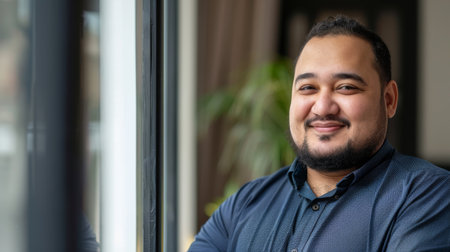 Close-up portrait of a successful intelligent bearded Indian businessman, manager or IT specialist, wearing a white shirt, looking at the camera with a friendly smile