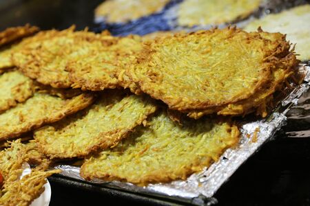 Freshly fried crunchy golden latkes, traditional food