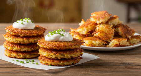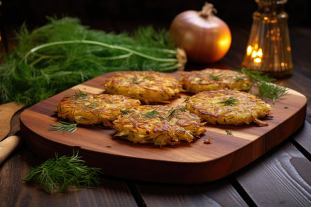 golden potato pancakes decorated with onion rings and chopped scallions, created with generative ai