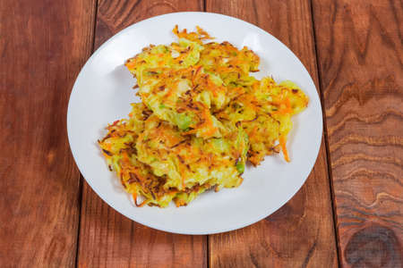 Fried savory cabbage pancakes on white dish on the wooden rustic table