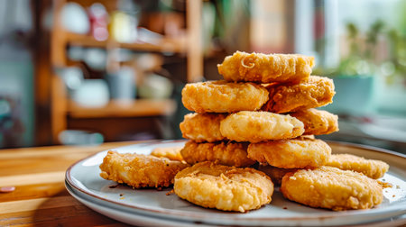 AI Generated. A plate of golden hash brown patties on a wooden kitchen table