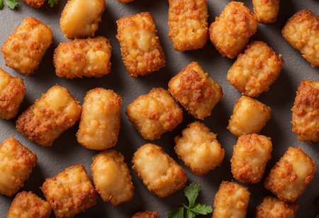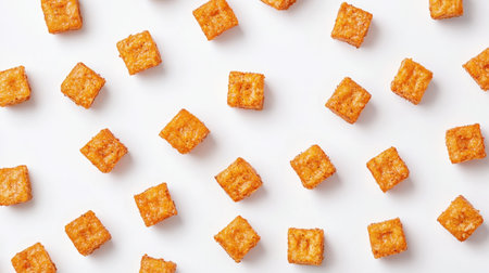 An eye-catching arrangement of crispy golden snack cubes on a clean white background, ideal for food-themed projects or marketing culinary delights with a playful touch.