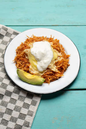 Dry fideo soup with cheese and sour cream on turquoise background