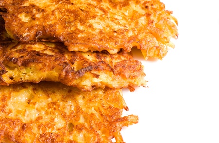 Delicious potato pancakes forming a stack, the top one slightly leaning over the edge, isolated on a white background