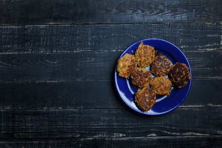 Meat and carrot cutlets on blue plate standing on black wooden background. Tasty unhealthy food. Diet, nutrition, eating habits concept. Place for text