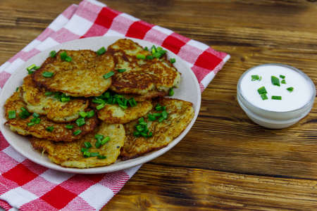 Potato pancakes with sour cream on a wooden table