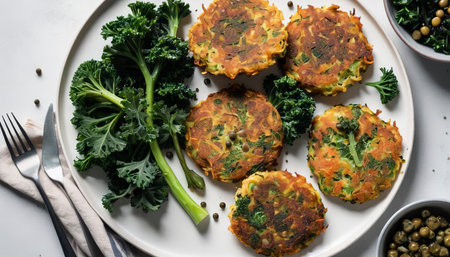 Flat lay of fried vegetable fritters with broccoli, kale, and capers