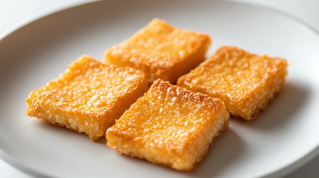 A close-up of a crispy, golden-brown serving of arranged neatly on a white plate, with a light shadow and clean, minimalistic background.