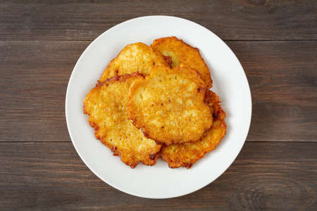 Fried grated potatoes pancakes served on the plate.