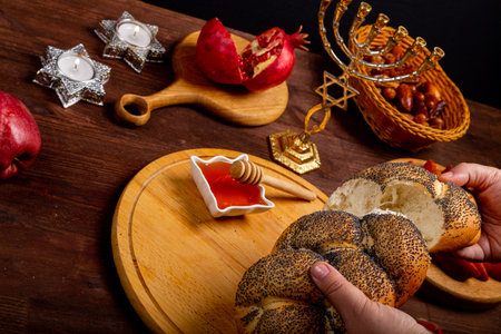 Female hands breaking challah on the table in Rosh Hashanah next to an apple, pomegranate, honey, menorah and burning candles. Horizontal photo.