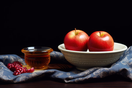 Rosh Hashanah traditional symbols Jewish New Year holiday apples, honey, pomegranate with ritual kosher dessert