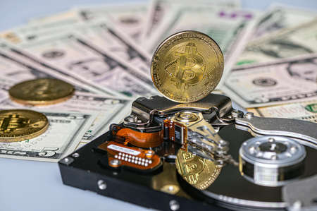 Bitcoin BTC coins, open hard drive and dollar bills, cryptocurrency and digital payment system