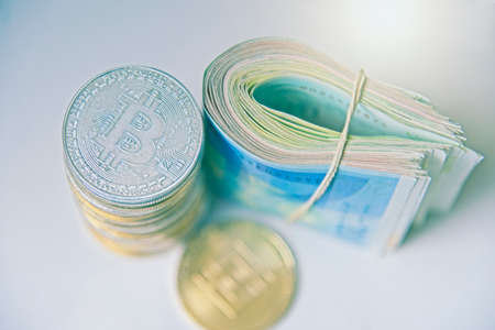 Roll Israeli Shekel ILS banknotes near cryptocurrency tokens Bitcoins btc, saw from above, on white background. Selective focus. with space for text placement. Isolated