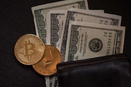 Dollar banknotes and Bitcoins on a dark wooden table
