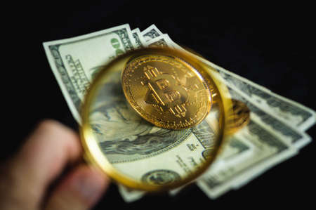 bitcoin on American dollar bank note with searching sign