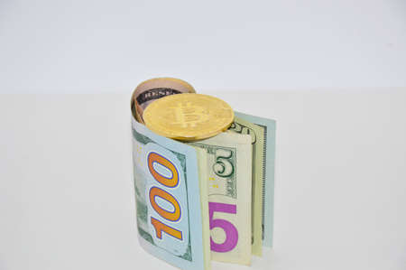 Bitcoin or BTC golden coin with sign of cryptocurrency and Us dollar banknotes