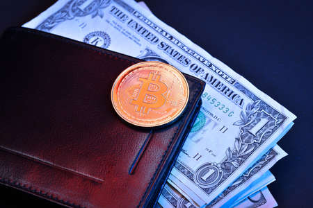 Biktcoin coin lies on paper dollar banknotes. Concept of virtual currency in exchange for cash.
