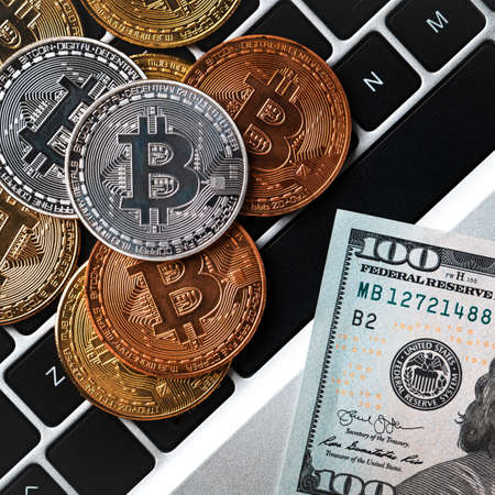 Piled up bitcoins on one hundred dollar bills. Exchange digital currency with dollar concept