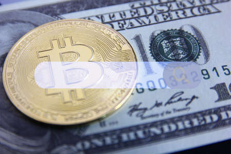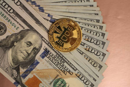 Golden Bitcoin lies on the banknotes.New virtual money. Crypto currency top view. Real coins of bitcoin on banknotes of one hundred dollars. Exchange, commercial. online business concept.