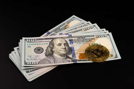 A symbolic coins of bitcoin on banknotes of dollars. Exchange bitcoin cash for a dollar. Black background.