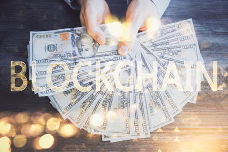 Multi exposure of blockchain theme drawing hologram and USA dollars bills and man hands. Business concept.