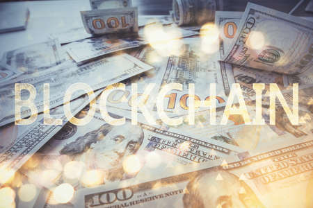 Multi exposure of crypto theme drawing over us dollars bill background. Concept of blockchain success.