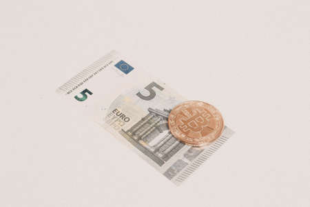 Digital cryptocurrency gold bitcoin lying between US Dollar and Euro banknotes. Difference between virtual money and cash. Concept of new virtual money