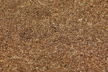 Wood sawdust background closeup. Sawdust floor texture. Top view. Sawdust texture, close-up background of brown sawdust.