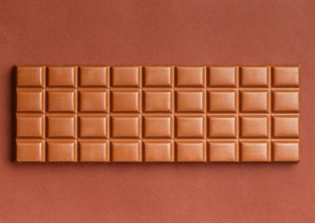 Large whole chocolate bar on brown background, top view. Milk chocolate isolated.