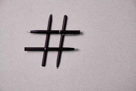 Blogging, blog and blogger or social media concept: pens and hashtag symbol on grey background. Flat lay.