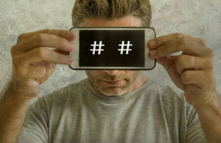 conceptual portrait of man internet addict and obsessed man holding mobile phone with hashtag symbols positioned as eyes in social media addiction concept isolated on grunge background