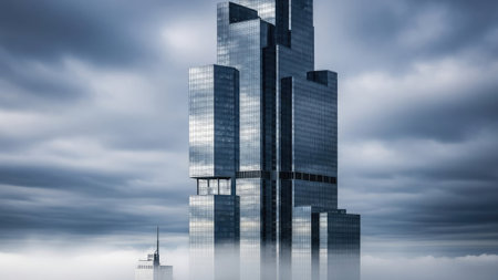 A stunning modern skyscraper rises against a backdrop of dark storm clouds, showcasing a sleek glass facade that reflects the tumultuous sky, symbolizing urban resilience.