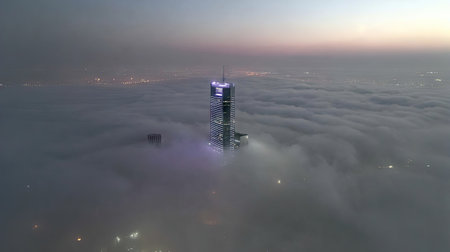 A towering skyscraper looms above, its top shrouded in thick fog against a gray sky.