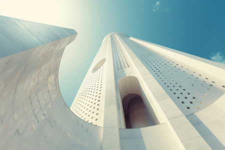 The modern architectural building or skyscraper with bright blue sky. Low angle view of tower central or office or work place. Abstract picture of city lifestyle or urban lifestyle concept. AIG42.