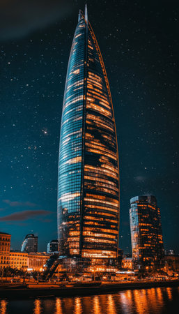 Modern, Glowing Skyscraper Piercing the Night Sky above River, Saint Petersburg, Russia